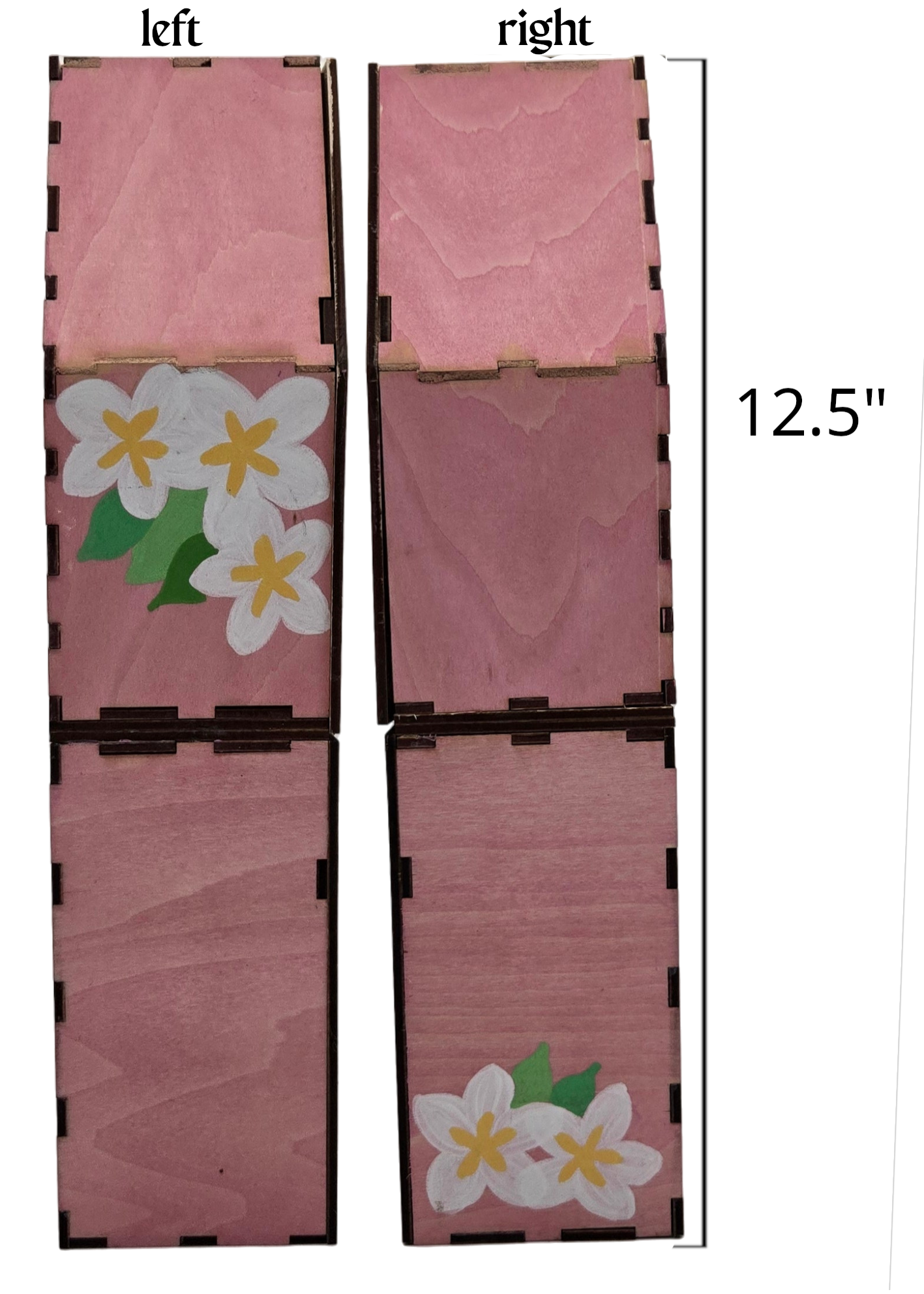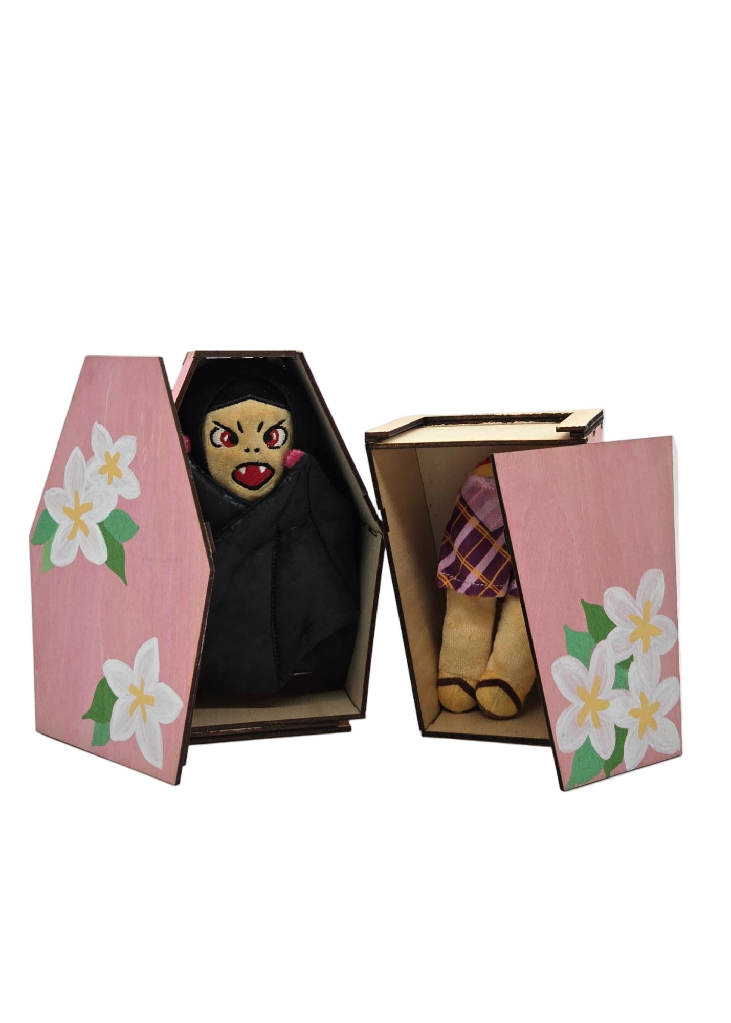 The coffin box is made from wood and handpainted. There may be slight imperfections due to the handmade nature of the display case.