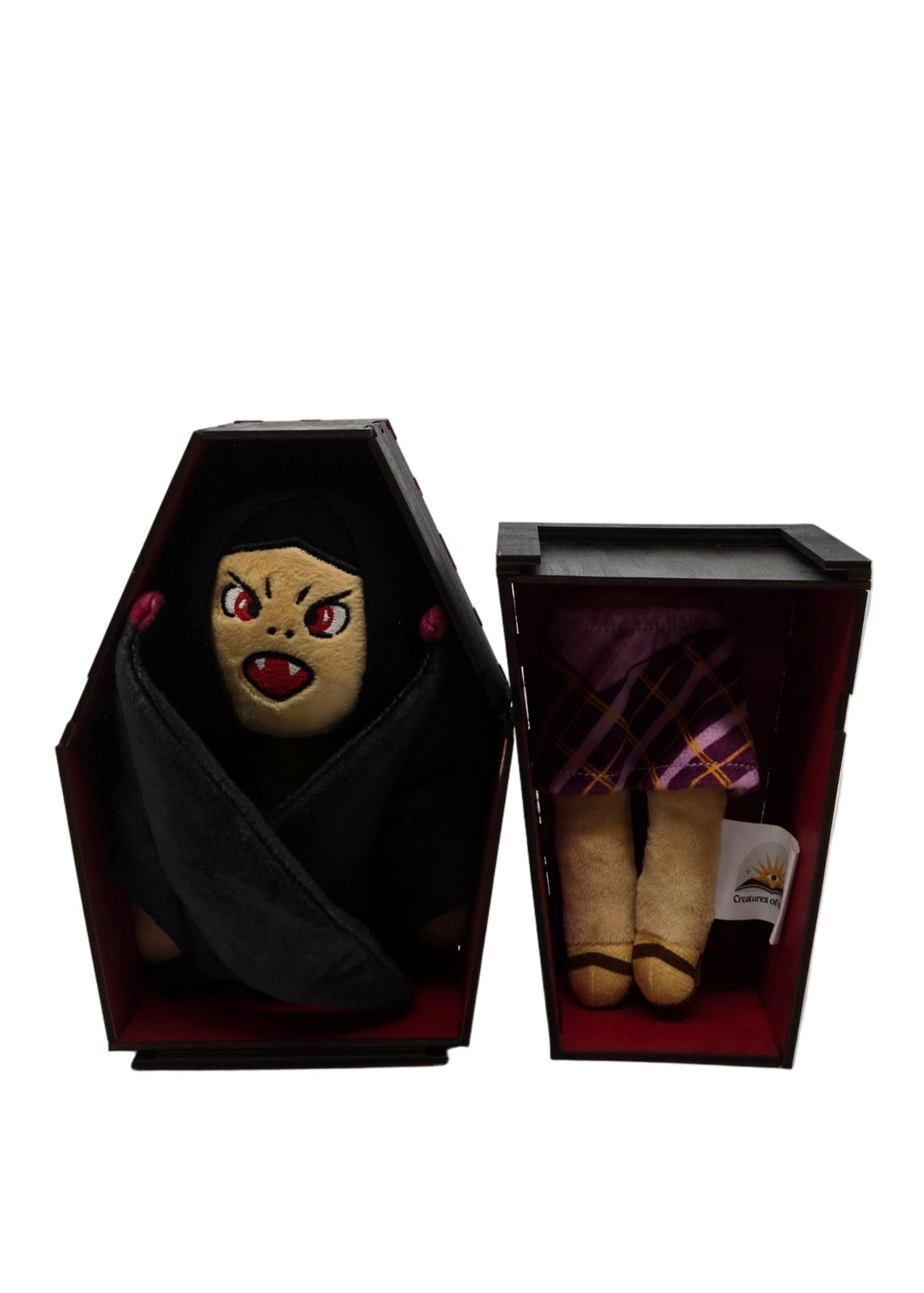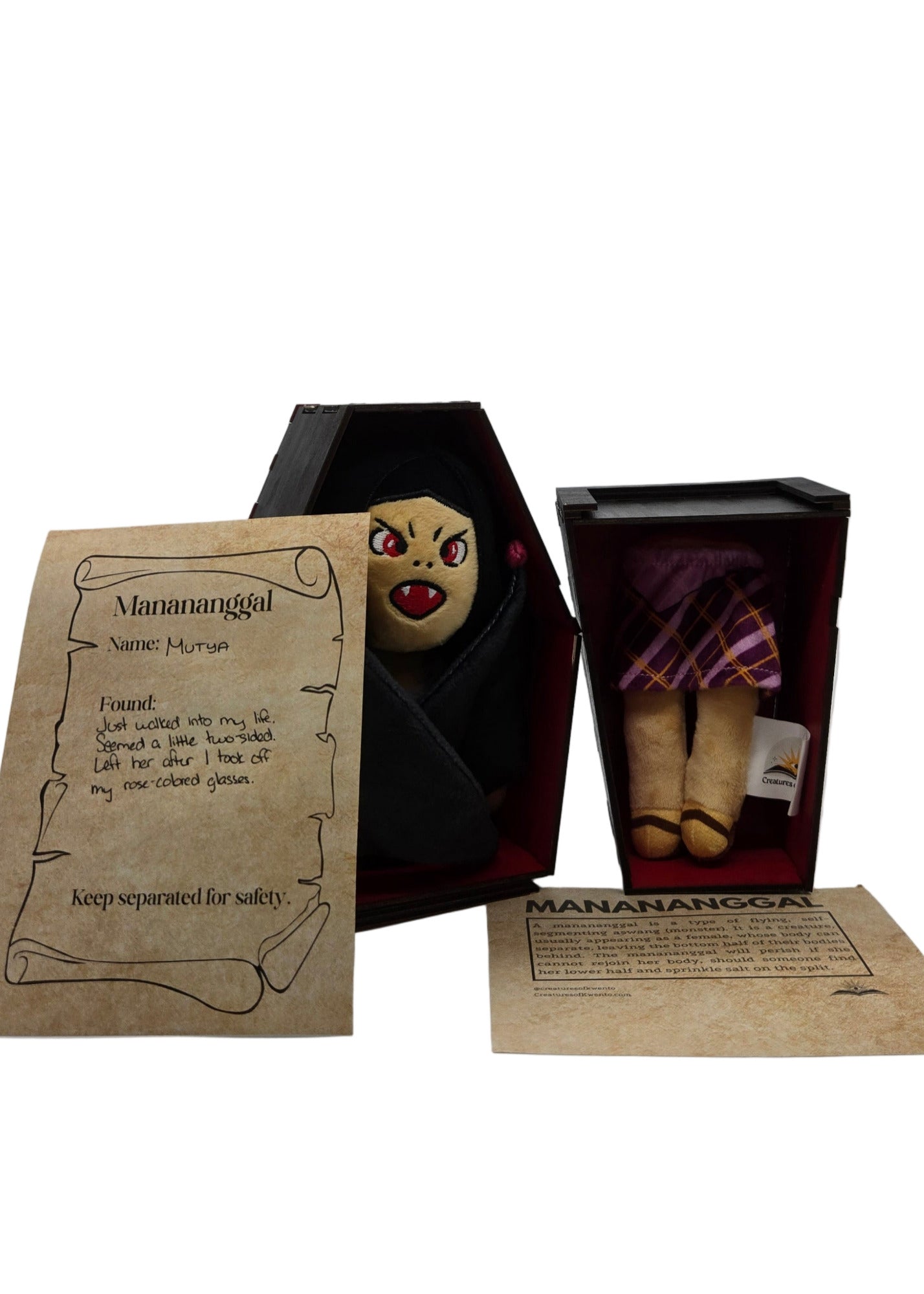 Mutya the Manananggal actually walked into someone's life. They unfortunately thought Mutya was two-sided, eventually leaving her behind in a decorative resting place. Her coffin is able to be separated and re-attached by sliding the top and bottom pieces together. Display Mutya in a full coffin (while still keeping her famous split visible), or separate the coffin boxes to really show off her lore.