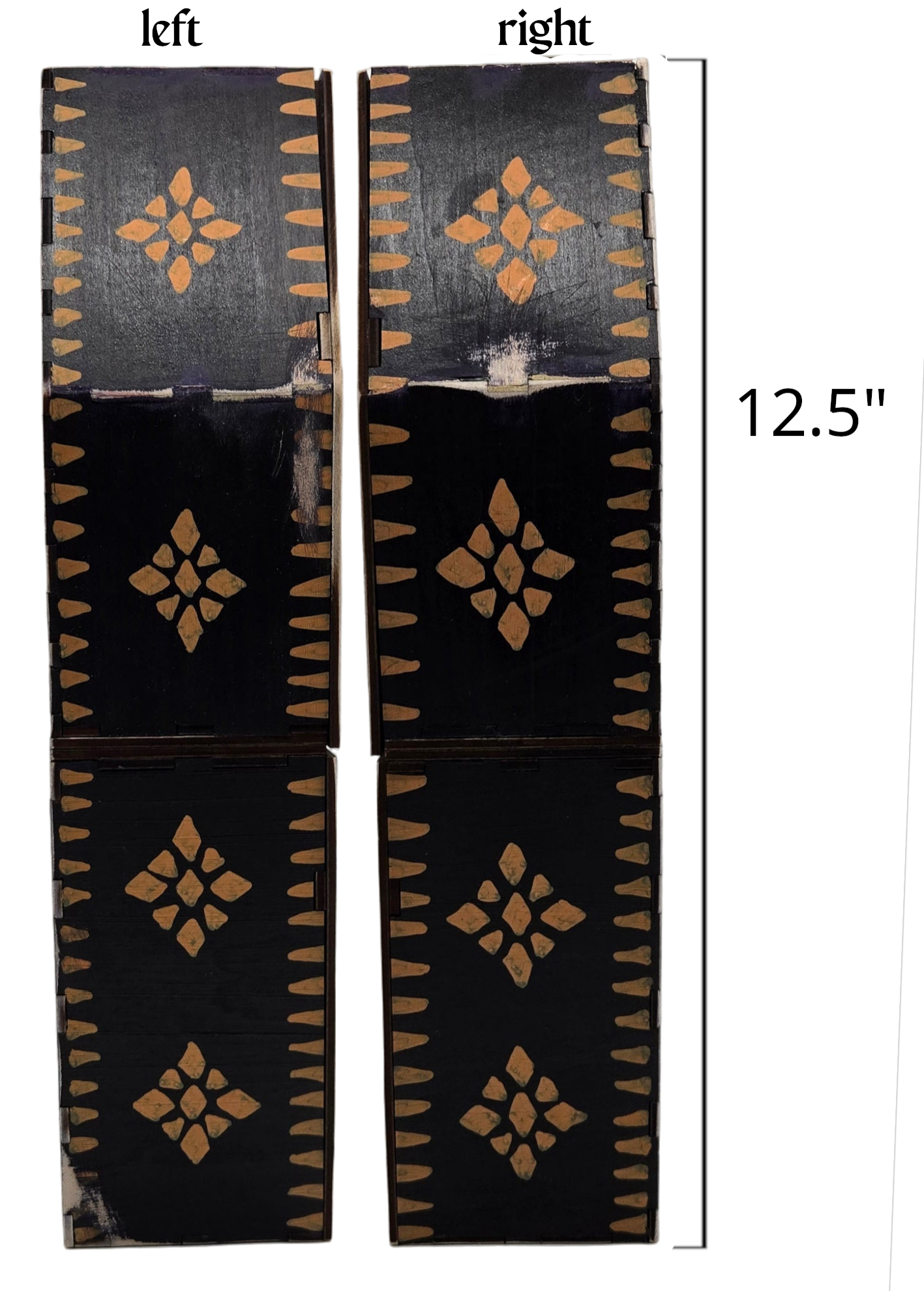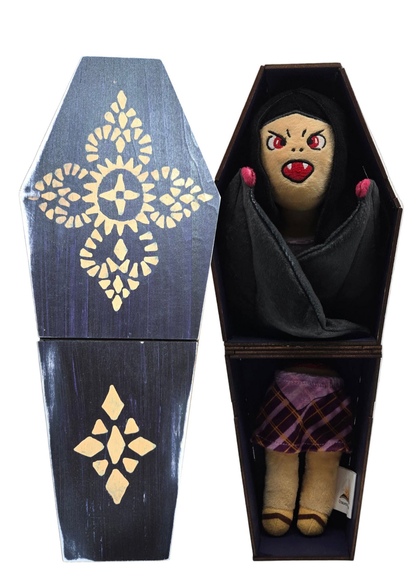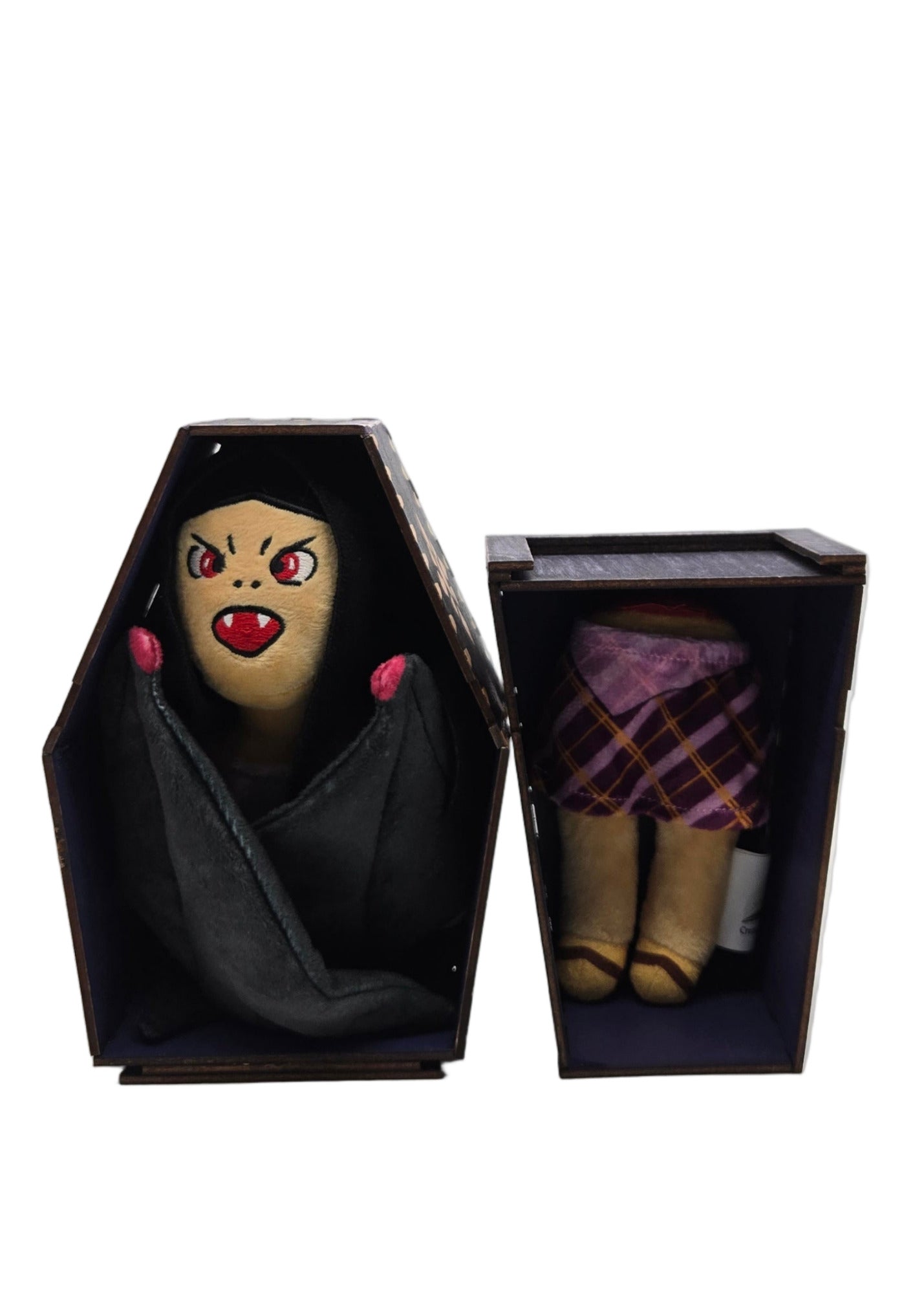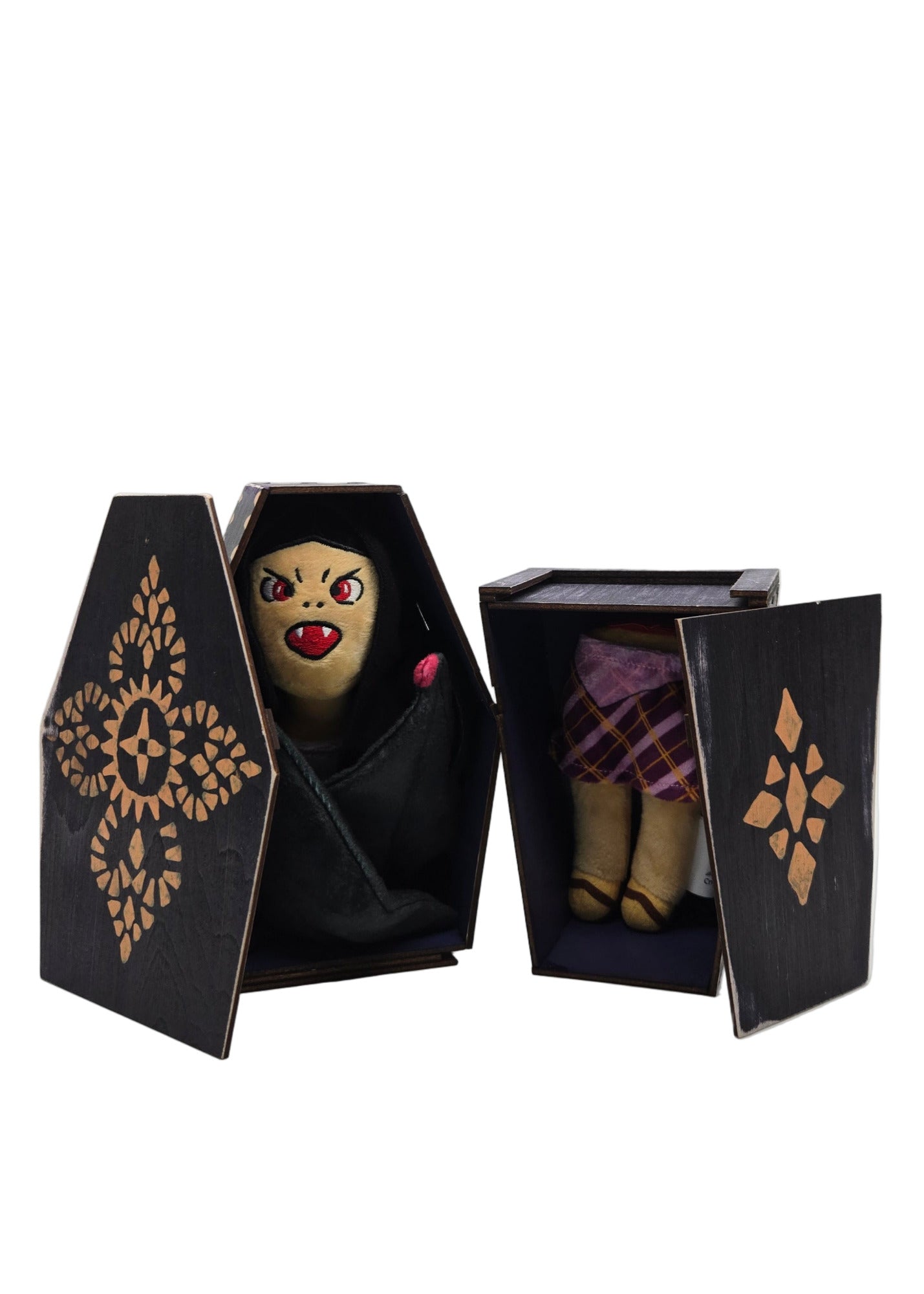 The coffin box is made from wood and handpainted. There may be slight imperfections due to the handmade nature of the display case.